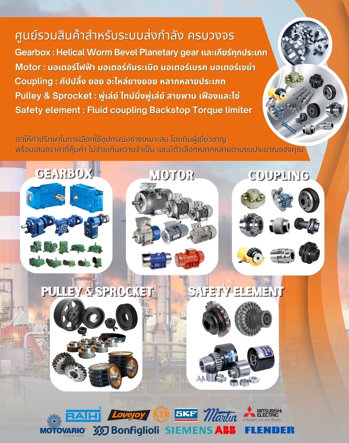 ไม่ว่าคุณจะอยู่ในอุตสาหกรรม อาหาร พลาสติก เหล็ก เคมี น้ำตาล ปูนซีเมนต์ เหมืองแร่ หรือระบบ สายพานลำเลียง เรามีสินค้า เกียร์ มอเตอร์ เฟือง โซ่ คัปปลิ้ง พู่เล่ย์ ที่ตอบโจทย์การใช้งานได้อย่างครบถ้วน แม่นยำ