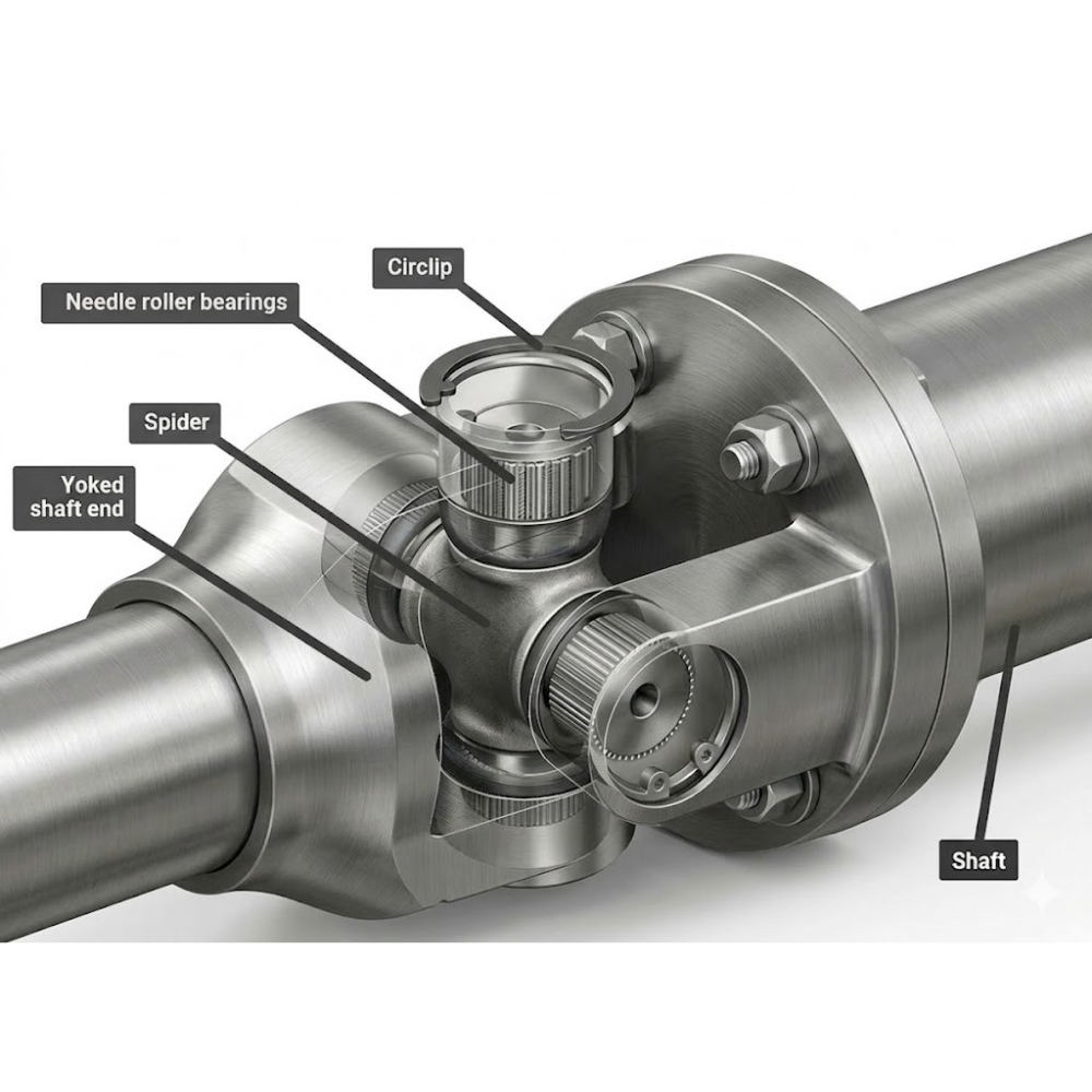 - Bearings (ตลับลูกปืน) มักเป็นลูกปืนเข็ม (Needle Bearings) ที่ติดตั้งอยู่ตรงปลายกากบาท